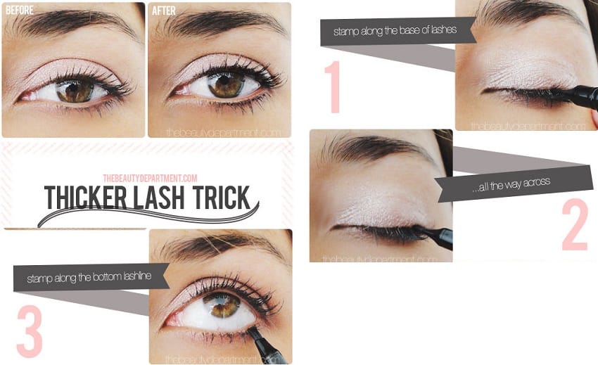 You don’t require any false lashes to make them look thicker and fuller. According to this chart, you only need a liquid or crème eyeliner to make your eyelashes appear thicker, fuller, and more attractive. It also shows you the correct technique of applying the eye liner effectively to get the best results.