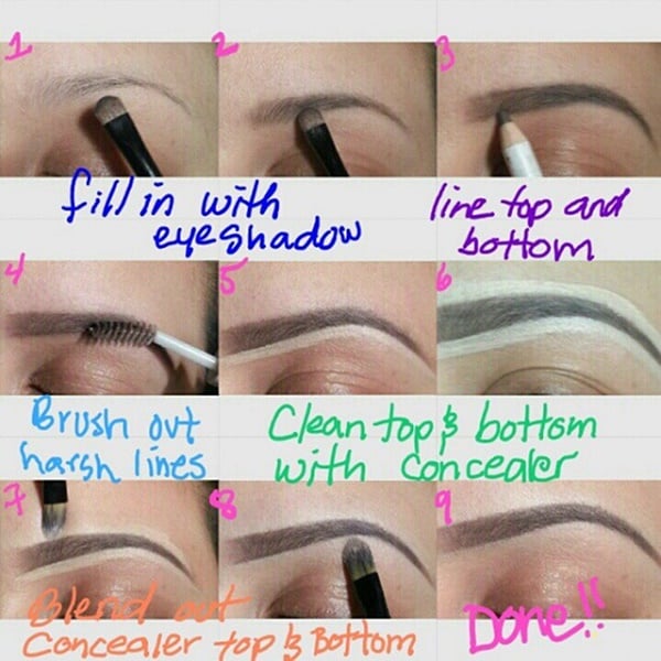 You need to first acquaint yourself with your face and eyebrow shape. This will help you to give proper shape to eyebrows in accordance with the shape of your face. The second chart shows you how to fill out eyebrows using a concealer. This will make them shine so that they stand out.