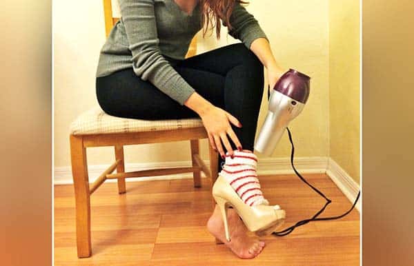 Put on a pair of socks before sliding your feet into the pair of heels and afterward blow dry your socks. You can use them as your insoles throughout the day. This will make breaking into your new heels a piece of cake.