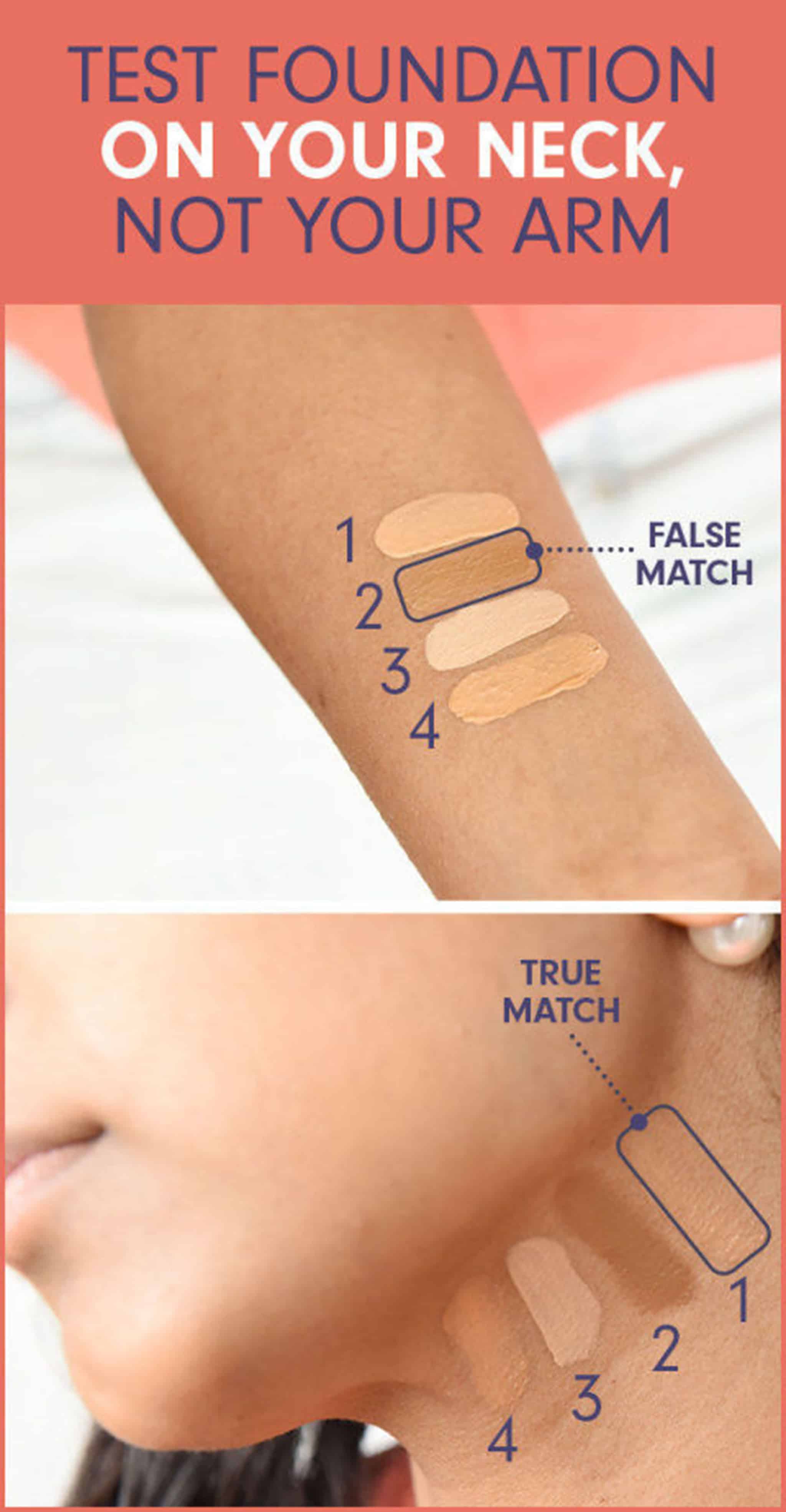 The choice of foundation should be based on your skin color. Test out the color beforehand on your neck and not your arms.