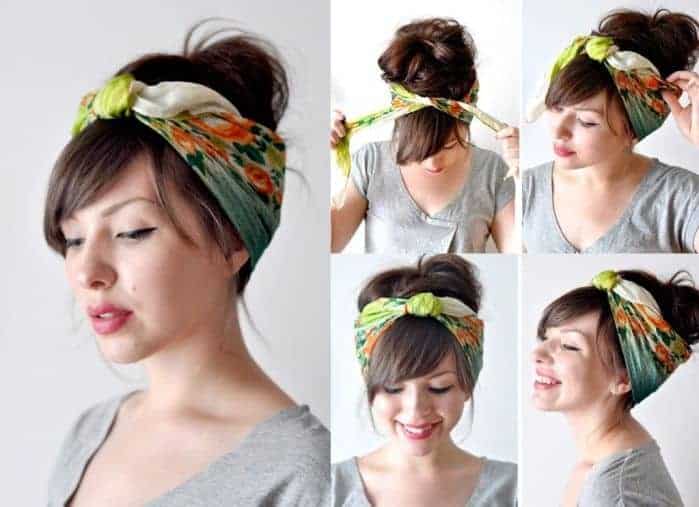 If you have short hair, try this one.This looks particularly preferable for a beach trip. Tie a scarf on your head and start tucking your hair from the sides. Continue this until the end, and that’s it! Isn’t it super easy?