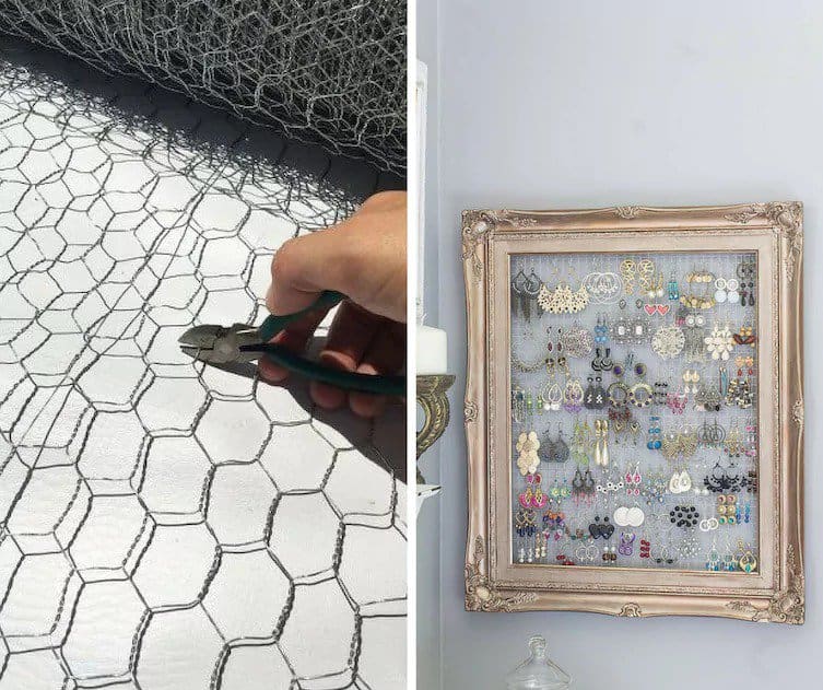 Create a masterpiece frame with chicken wire. Hang all your earrings on it. This will create a beautiful display, and you can save space as well as use them whenever needed.