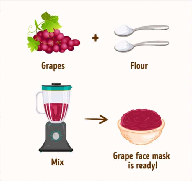 Red grapes for glowing skin: Red grapes are good for our skin. Just mash red grapes and apply directly on your skin, this will provides glowing skin and slow down the aging process. If your suffering from cracked skin condition then you have a great chance to heal that problem just check this article.