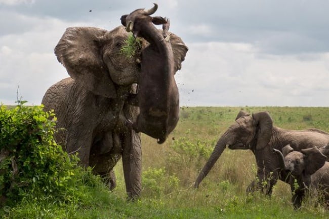 Elephants are powerful animals, and when it comes to defending their calves, they can be quite fierce. This photograph is unique and shows the power of a mother.