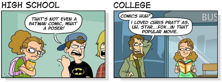 In high school, reading comics is a sign of superiority and being cool. In college, not so much as being lame.