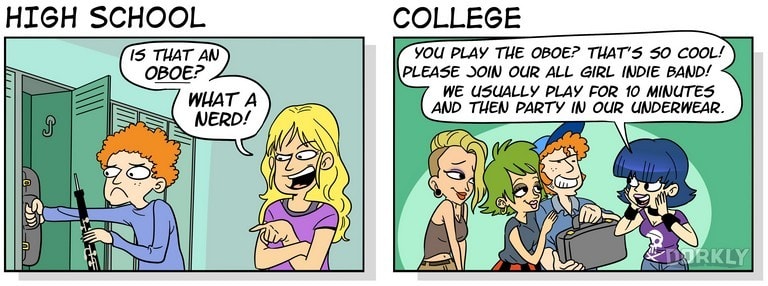 In high schools, your quirky hobbies are made fun of. In colleges, you are actively encouraged to pursue your quirky hobbies.