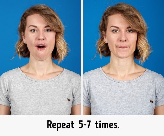 This exercise will strain your jaw muscles and pull your cheeks and reduce the chubby cheeks of yours. Start this exercise by turning your head to a side and move your jaw slightly forward and then come back to the original position. Then turn to the other side and do the same process. Perform this exercise 5 times