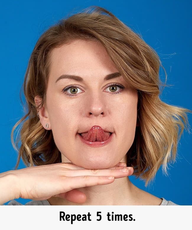 for this exercise move your tongue out of your mouth and try to reach for the nose with the tongue(tip of your tongue) and put your hands (back side of your palms below your chin and while doing this keep your lips relaxed and perform this exercise 5 times.
