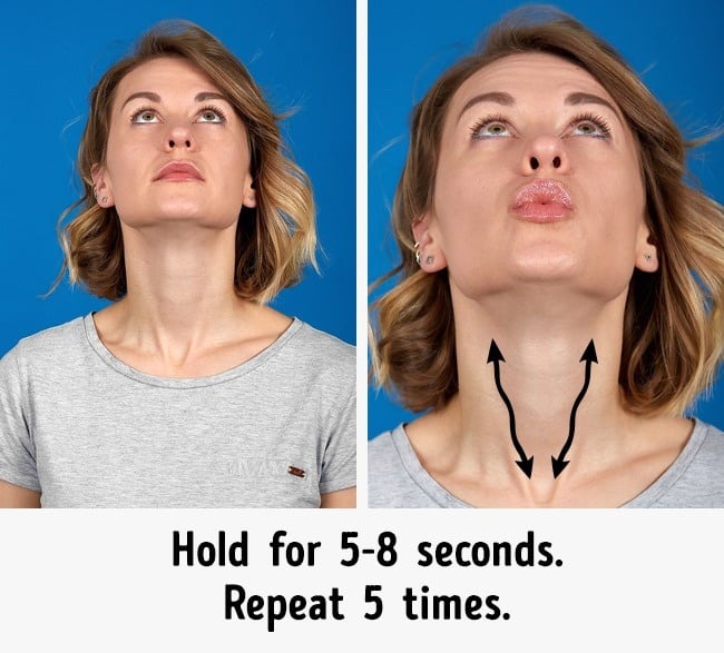 You can imagine like you are trying to kiss the ceiling. Turn your face upward and look at the ceiling and pucker your lips like you are going to kiss. This will stretch your neck muscles and remove the excess fat present in this area. After moving the face towards the ceiling and hold it there for 8 seconds and repeat it for 5 times to get rid of a double chin.