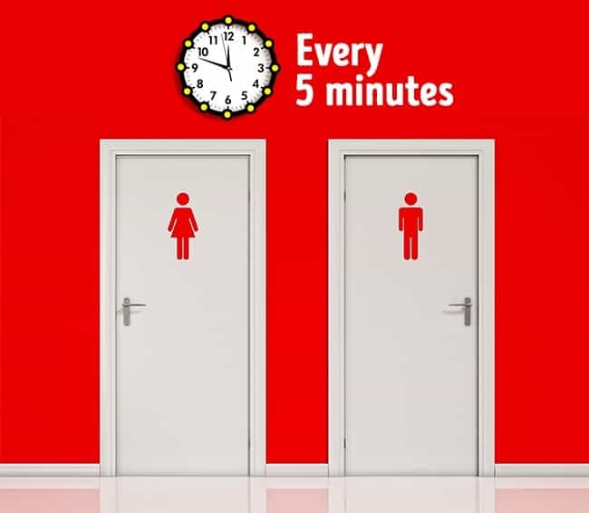 you have not drink much water but still you go to wash room every 5 -10 minutes then there is a possibility that your blood sugar level is much high . When your body contains excess sugar then your kidneys are forced to work overtime to filter the excessive sugar present in your body.