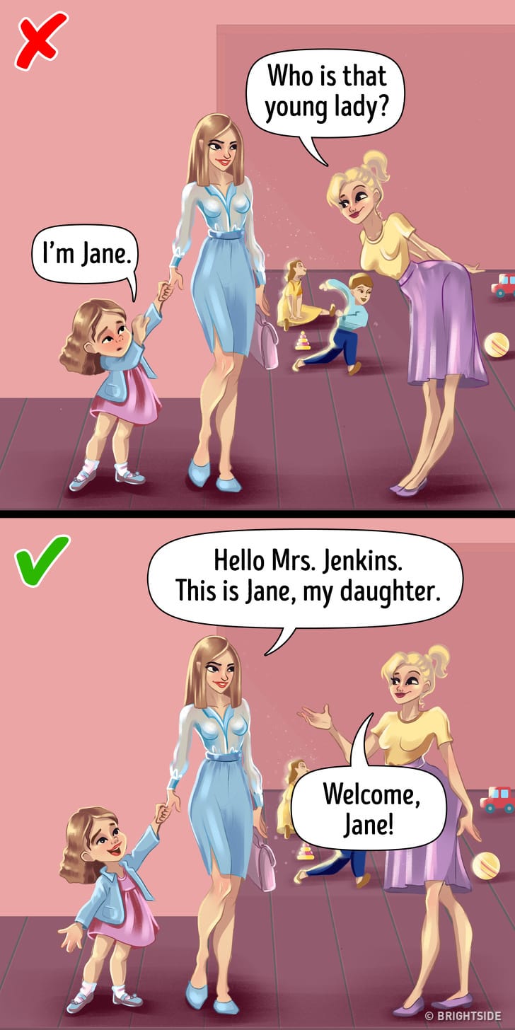 Kids always try to imitate the attitude of the parents towards other adults. When a child will find that parents are confident and to act nice when you communicate with some other people then the child will also feel the same.