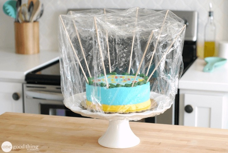 Well, we want the shape and decoration of the cake to remain the same for the whole time and even while transporting it. Put the cake into the dish and later stick to the wooden skewers on the toothpicks. Now cover the same with the help of plastic wraps. And now the cake will not get damaged or dried.