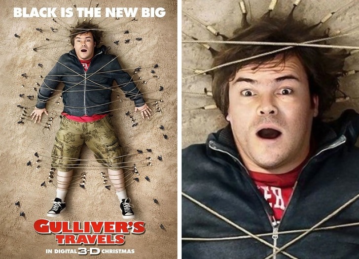 The hero Jack Black seems to be much worried that the small people had tied him up very crudely. Also, you can find out through the poster that his teeth are missing. We do not have any idea that how can we explain it because it is much hard to understand such facts. We even cannot find out that why the artist especially planned to cut out his teeth and hide them especially that black one and his tongue.