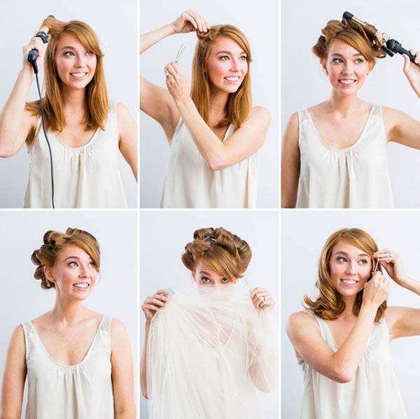 Divide hair into three sections, make two peaks side by side. Roll your open hair inside and pin, insert the peaks capture with the pin.