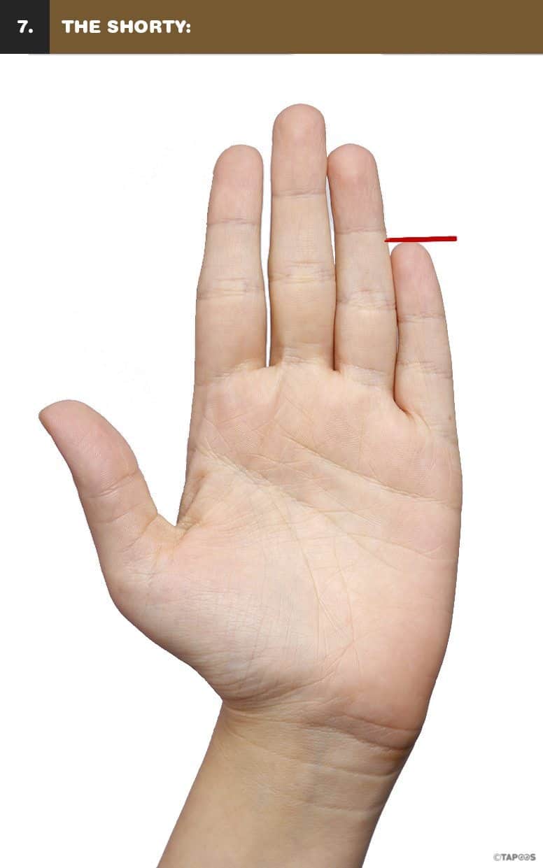 Some people have pinkies that are shorter than the top line of their ring finger. These people are usually introverts who tend to be reserved and shy. They aren’t that good with strangers, and often, have low self-confidence and tight lips about their thoughts and feelings. However, these are the kind and caring people.