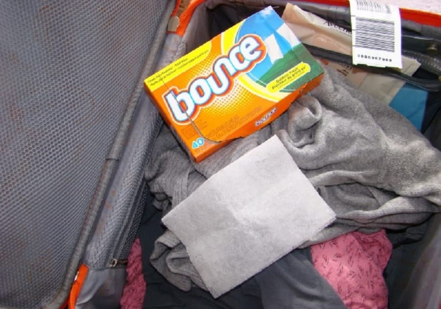 While on the go, discard the foul smell from your suitcase by throwing a couple of dryer sheets into the suitcase.