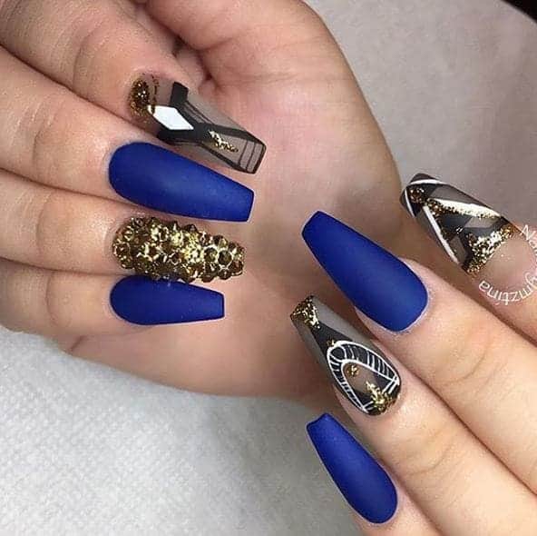 Royal blue is a must-have nail color this season! It is such a beautiful, vibrant color and it gives a royal feel to the person wearing it.It can be kept simple or can be paired with other designs and accents. You have a variety of options. You can wear metallic royal blue polish or a blue polish with a matte top coat. The possibilities are just endless!