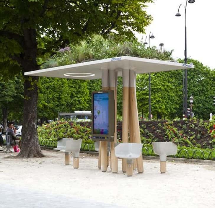This is one of the many Wifi stations present in Paris where visitors can charge their phone, work on their laptop or search for any information on a large screen. Also, if you remember we talked about flowerbeds in unusual places; there is a flower bed on top of this structure too.