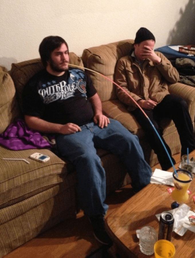 One of the best inventions for lazy people. Well, people in this world are slothful such that they even think it difficult to hold the glass and drink some fluid. So as we can see the above photograph, the man finds it difficult to swallow, so he connected three long straws with each other. It is the automatic way of drinking that they will not have to put any effort into this. See the results that what he is doing. The guy sitting next to him is not feeling proud of him.