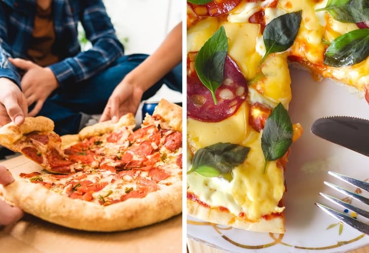 If you are sitting with your friends and enjoying the party, then you can take the pizza to your plate with your hands. The environment around you is informal. But if you are at the business meetings then cut the pizza with the help of fork or knife and then take to your plate.