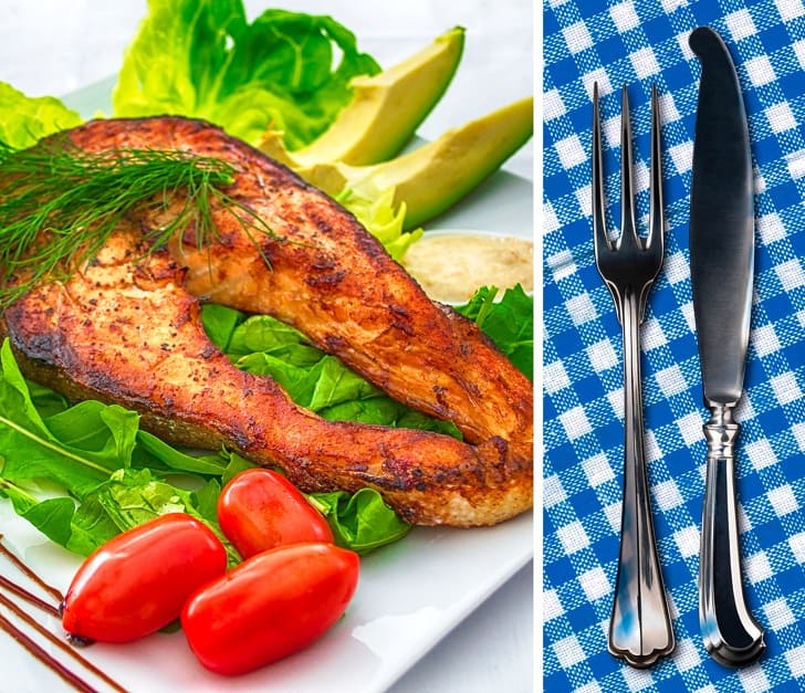 Fish streaks are generally made from salmon or trout. It can be easy to eat them with the help of a fork with three prongs and a spatula-like knife. Fish is very soft to eat, and so you can separate it with the help of the blade. And after that pick its one piece with the help of the fork to your mouth. A knife also helps in the separation of bones from the skin.