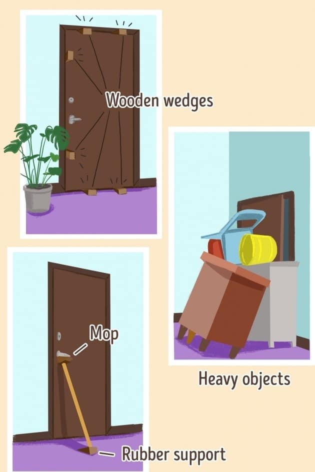 If you want to barricade a door, then you can place the wooden edges to put around the door. The mop you put under the door handle can also hold it well. Then you need to give some support so that broom will also not slip down.