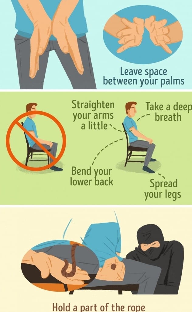 It is quite challenging to untie your hands. And if someone ties you, then press your thumbs against each other by leaving some space you can get the chance to free up your hands. If you are on the chair, then take a deep breath and spread your legs.