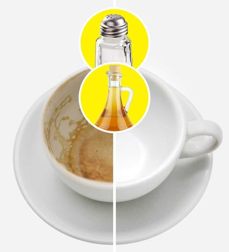 Irked with the tea and coffee stops on your cups? Don’t you worry! All you need is 1 tbsp of vinegar and 1 tbsp of salt. Mix the two well and apply them on the cup wherever the spot is. Keep the cup undisturbed for two-three hours and wash them with tap water. Now enjoy your tea or coffee in new spot-free cups.