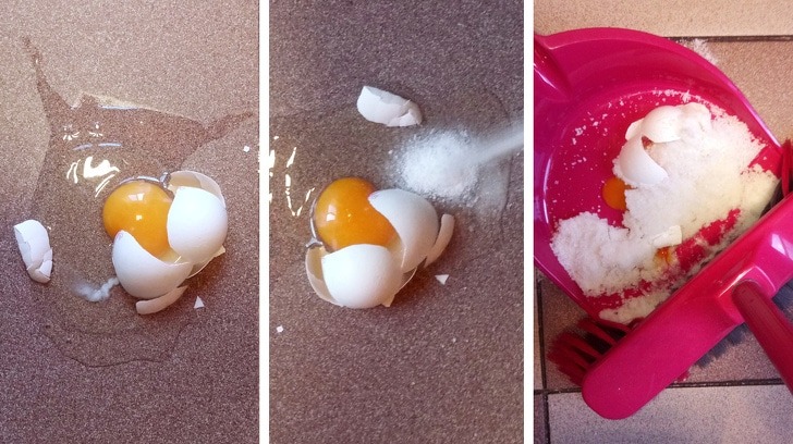 You can easily remove the broken eggs from the floor. You need to cover the broken egg on the floor with the salt. It will dry up only in five minutes. After it dries up, you can swipe it with the dustpan or can also use a wet towel to sweep it up.