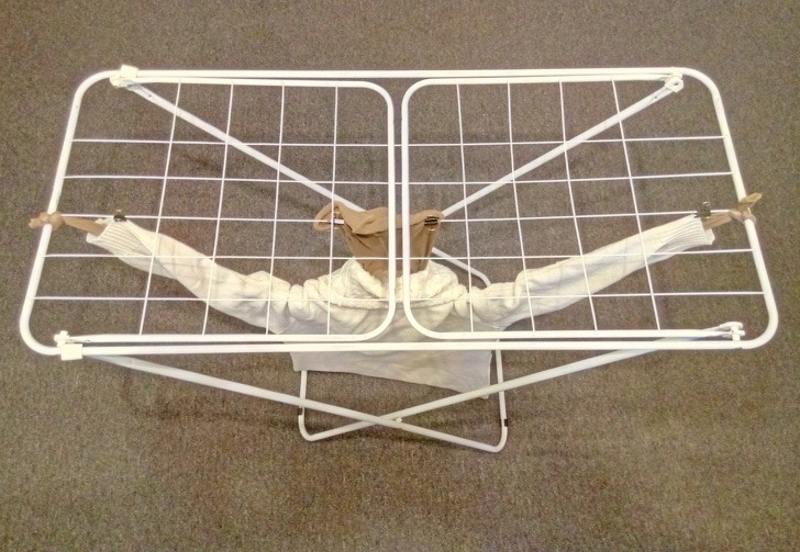 To dry up a woolen sweater in an easy way, you can loop the pair of tights’ waist area through the throat cut of a sweater and sweater’s sleeves through its legs. As it gets shown in the above picture, you have to hang it on a clothesline or air dryer. Your sweater will not become larger in this way, and it will get dry faster.