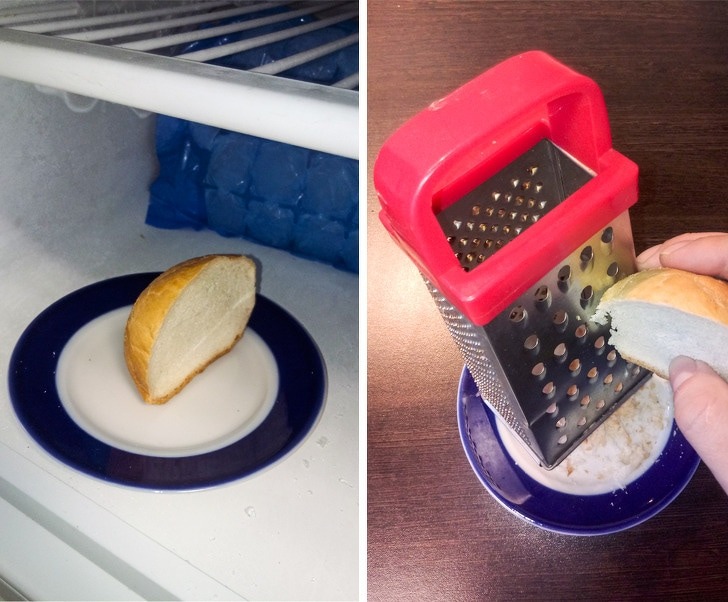 There is an effortless way to cook breadcrumbs. We need to freeze the piece of bread in the freezer and then grate it to cook. The frozen bread can easily get grated. Grating soft bread is tough.