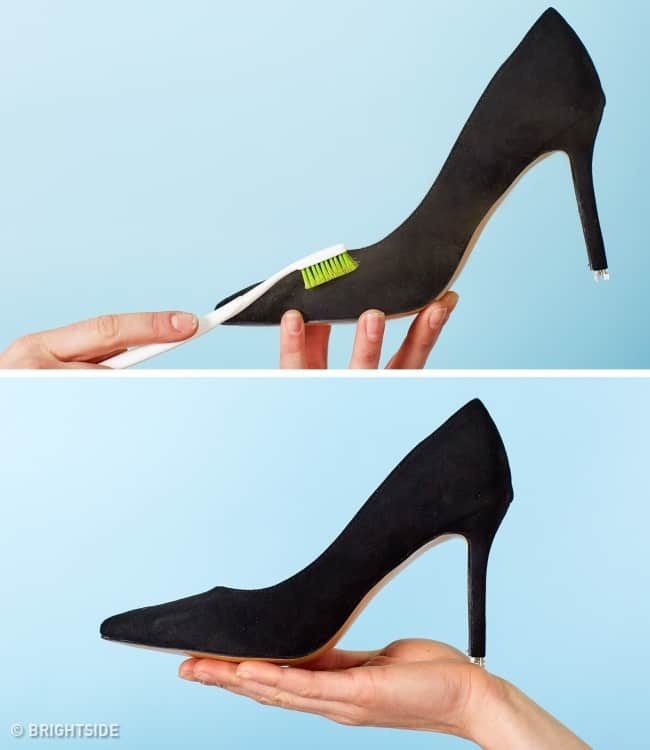 Suedes are so beautiful, and they get dirty very quickly. Use a little toothbrush to clean the dirt from the velvet heels. You need not use any professional brush to clean the suede. A toothbrush will remove the dirt softly and will not damage the fabric.