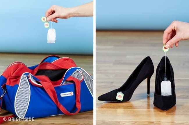 Sometimes our shoes become very smelly because of sweat. Here we have a solution to get rid of smelly shoes and gym bags. Take the tea bags and place them inside the smelly shoes and gym bags for overnight. In the morning you will find your shoes and bags smell free.