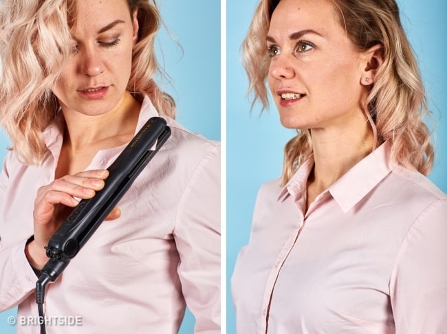 You are in so much hurry because you have to go to a meeting, but your shirt not ironed. Don’t worry here we come up with a solution. Use your hair straightener to iron your shirt. Place the hair straightener on the collar of the shirt and press it.