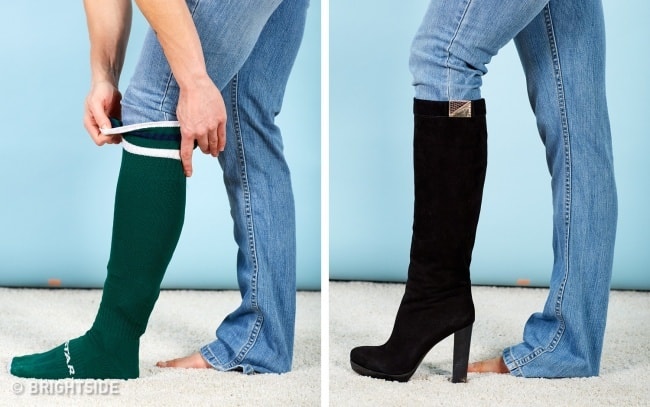 Boots don’t look good with loose jeans. To hide your loose jeans wear long socks over the jeans and then wear your long boots. Now go and rock your boots.