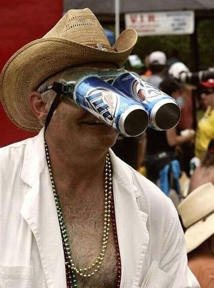 I think no one would have such great binoculars before this time. But the man is enjoying his ride and the watch with the beer binoculars. He is making the correct use of the cans.