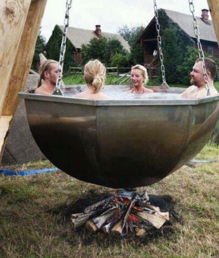 Well, I think the group friends wanted to enjoy there evening together, but it was cold outside, and hence then they thought of using a trick to maintain the water tub and sit inside with the boiler placed below it. The pot is much enlarged that four of them get themselves fit in it.