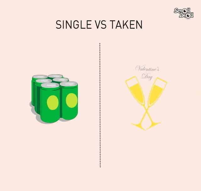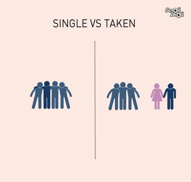 Differences between single and taken guys. Being single as necessary as being in a relationship with someone. The time you spend as a single individual is important to find yourself, to live your life a little rashly, a little unthinkingly, to know your flaws but accept and love them just like the rest of you. When you get into a relationship, that company of someone else will fill up the void in you that you never knew existed.
