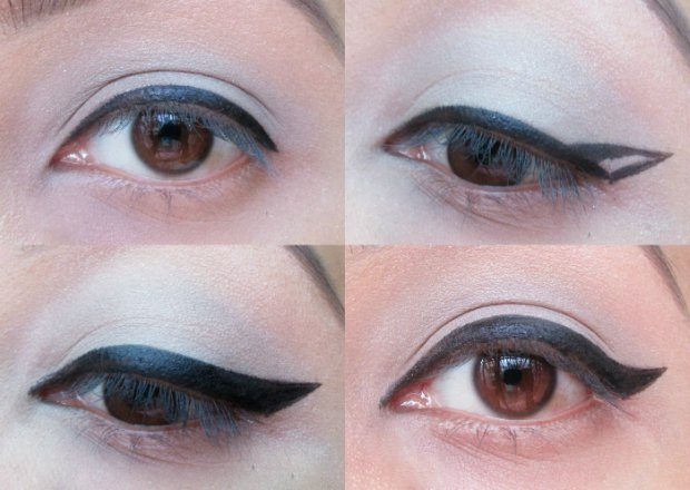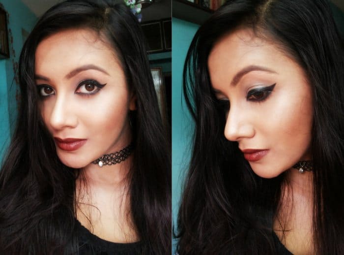 Next, draw a small line on the upper eyelid and create the base of your glam cat eyes. Then you need to create only the outer winged line; Make sure to create a sharp line and then finally join the line with your baseliner and fill up the rest of the eyeliner. Aim for and try to create a thick bold cat eye look. And trust me, It is super easy you just need to keep your hands steady, and that’s it. Don’t worry if you make any mistakes. You can always correct your tiny mistakes with the help of a concealer.