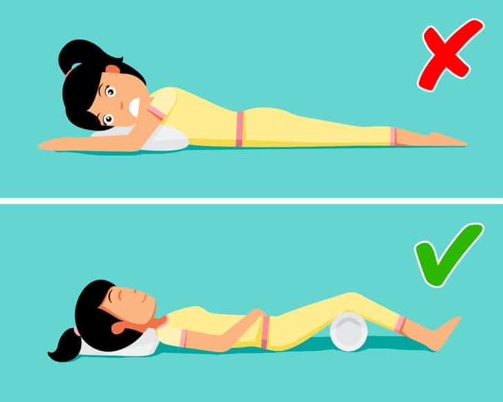 Always sleep on your back rather than that to sleep on your right side. Give support to your neck still and also keep the rolled towel under your knees.
