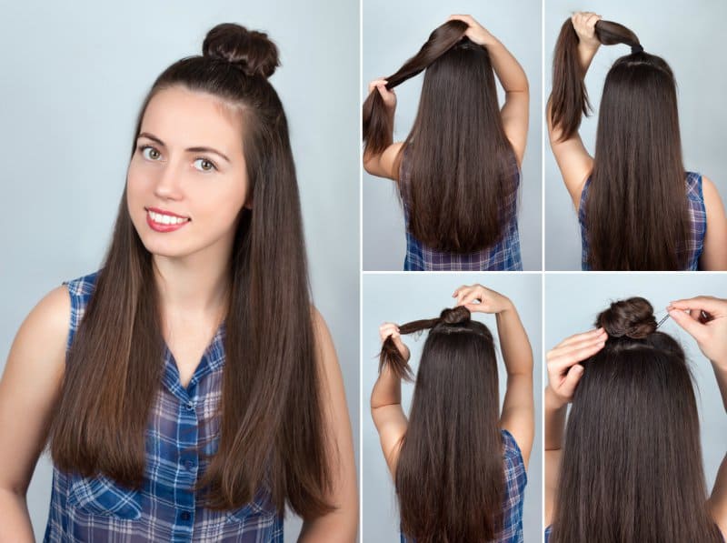 A very recent hairdo which I personally adore. You will have to manage a bun at the top half of the hair length. Tie the hair which is just behind the crown area and let the rest of the hair freely hang. This looks beautiful on everyone.