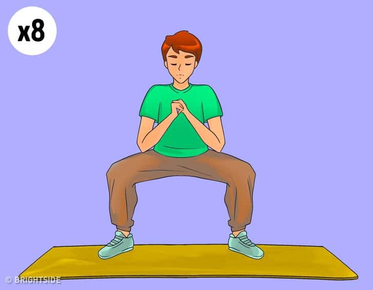To do these squats open your feet wide more than your shoulders and set your feet at a 45-degree angle. You have to do squats at a 90-degree angle and then repeat it same for 10-20 times.