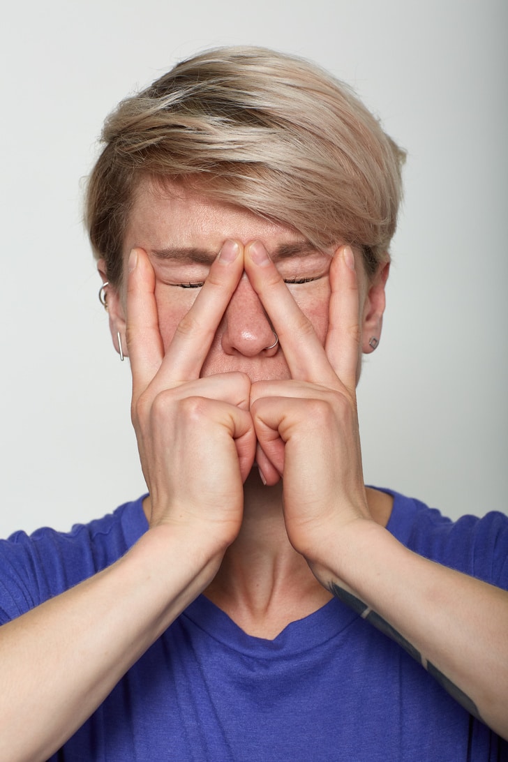 You have to place your middle fingers between the eyebrows over your nose and need to keep the index fingers at the corners of the eyes from the outer side. Press your skin slightly down with your fingers. Squint your lower eyelids and look upward.
