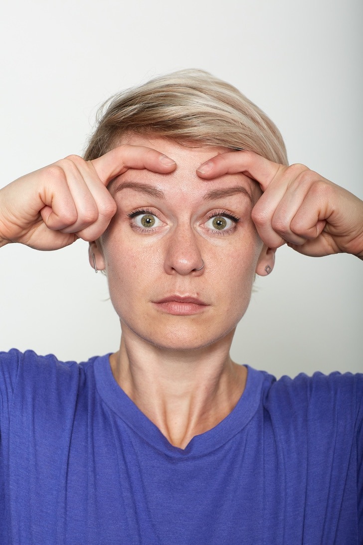This exercise helps in raising eyebrows. The formation of wrinkles also gets stopped by it. It also helps the smooth out existing ones.