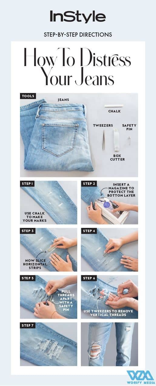 Wish for rip jeans? Then here is the solution. All you need is chalk, tweezers, a box cutter, and safety pins.