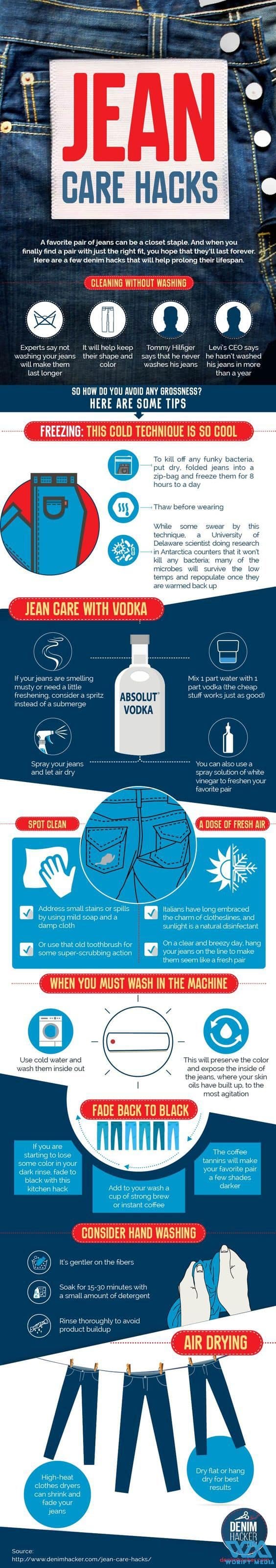 For making your jeans durable and last longer than prefer hand washing over machine wash. Also, follow these cool hacks mention in the picture for proper cleaning and removing stains without causing damage.