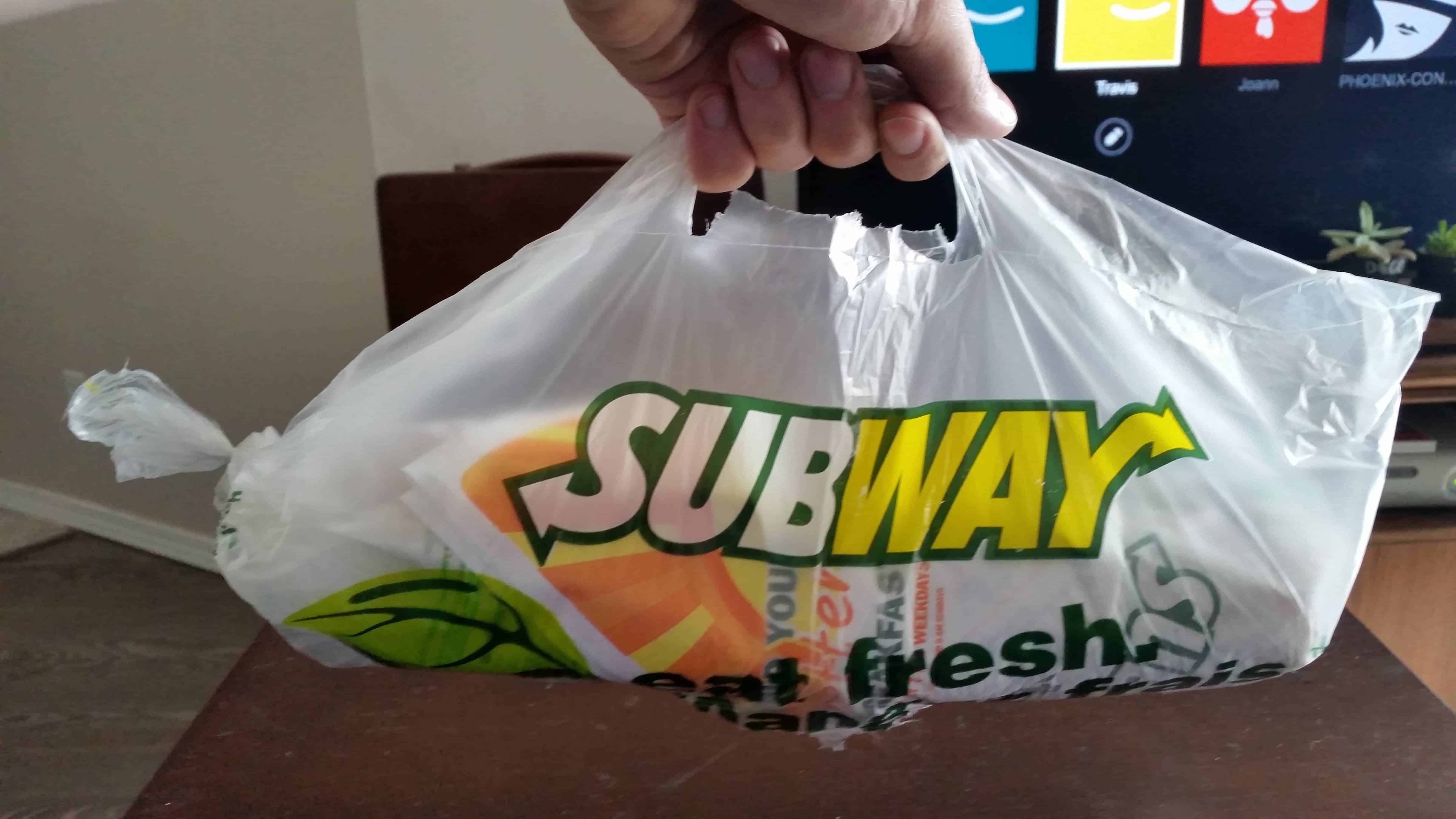 Carry your Subway bag as shown in the picture above. It is difficult to hold a vertical bag that consists of a mixture of uneven sauce and shifted toppings. The horizontal way will help you keep your food safe and even.