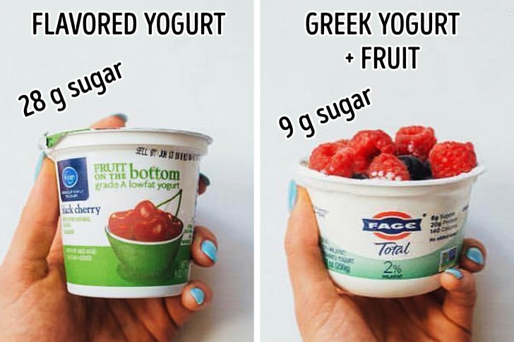 You can get huge differences by making little changes in your meals. The flavored yogurt adds 28 g of sugar with 6 g of protein. But Greek yogurt includes fresh fruits which provide you 9 g of sugar and 21 g protein.
