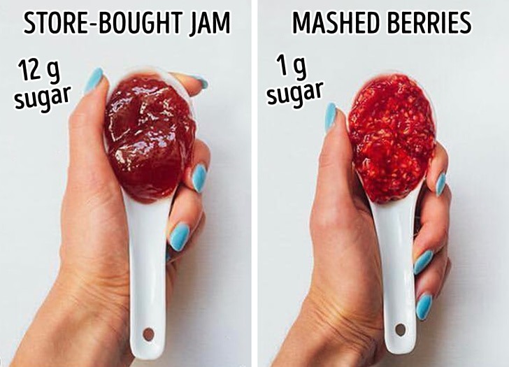 The jam box that you buy from the stores is full of sugar and also include high fructose corn syrup and also other preservatives. You should swap to the freshly mashed berries. There is no change in the taste, but you will save the consumption of sugar.