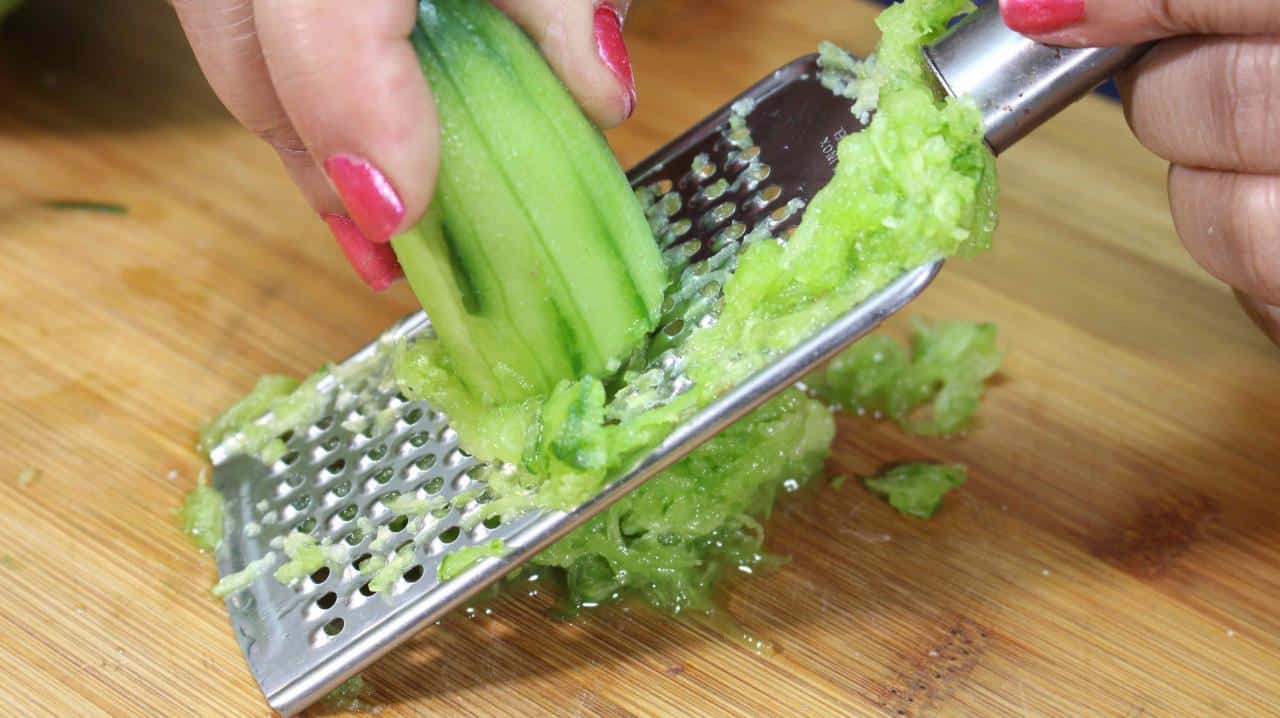 In the same way as that of potato grate the cucumber and also extract its juice with the help of teaspoon and the filter.